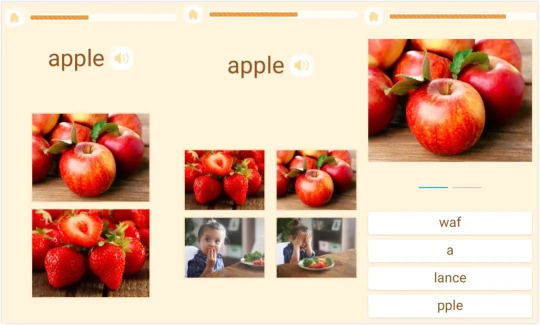 主要是将绘本中本节课学习的重点单词设计成选项形式由小朋友选择,正确之后会进入下一句。