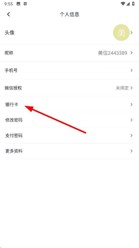 2、进入个人信息页面后,下滑找到银行卡的选项并点击。