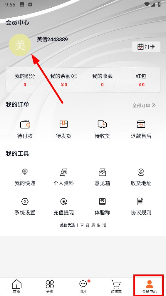 1、打开美信优选app后点击底部导航栏最右侧会员中心图标,点击上方的头像区域。