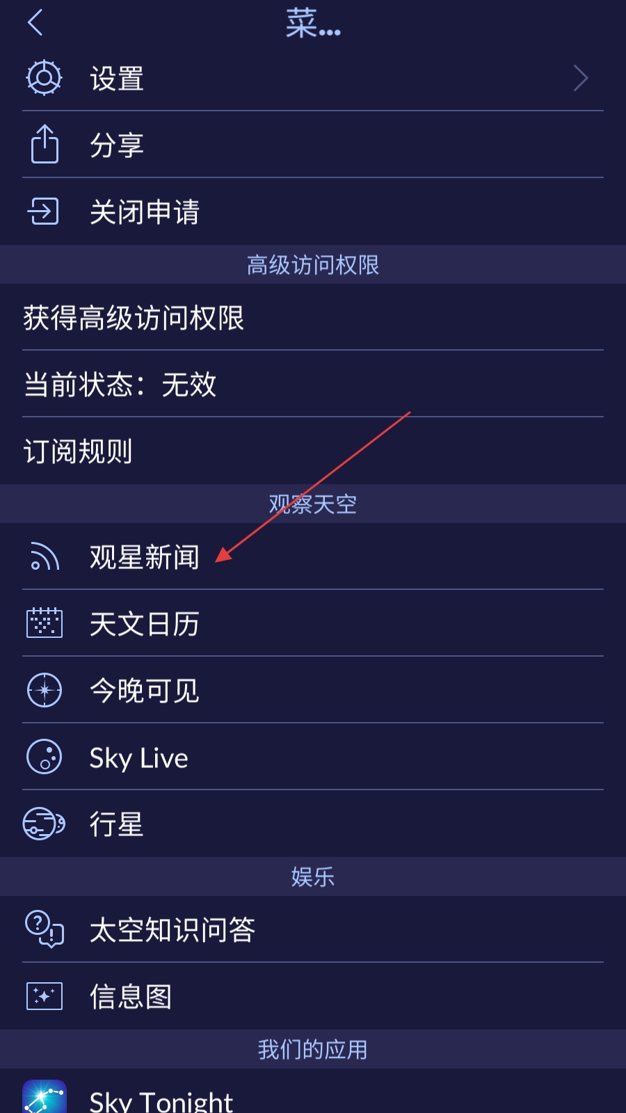 2、在功能菜单页面中,找到观星新闻选项并点击,进入观星新闻资讯列表页面。
