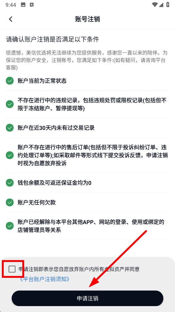 3、在账号注销页面,确认自己的账号符合所有条件后,勾选下方的确认框后点击申请注销按钮,即可完成账号注销操作。