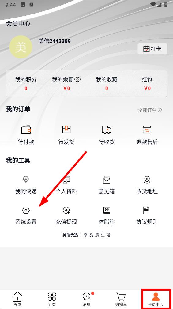 1、打开美信优选app,点击底部导航栏最右侧会员中心图标进入会员中心页面,在我的工具板块中点击系统设置选项。