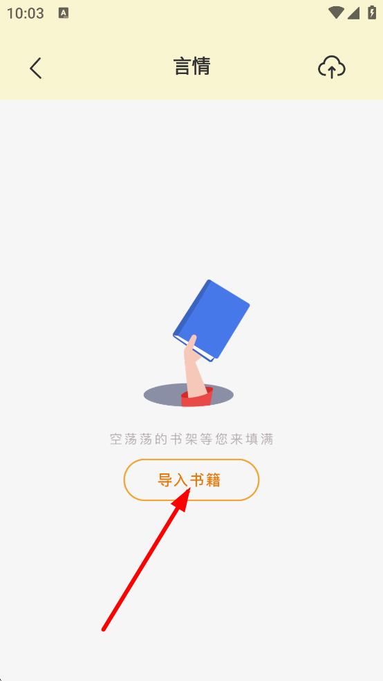 2、在言情类书架页面,点击导入书籍,进入上传书籍页面。