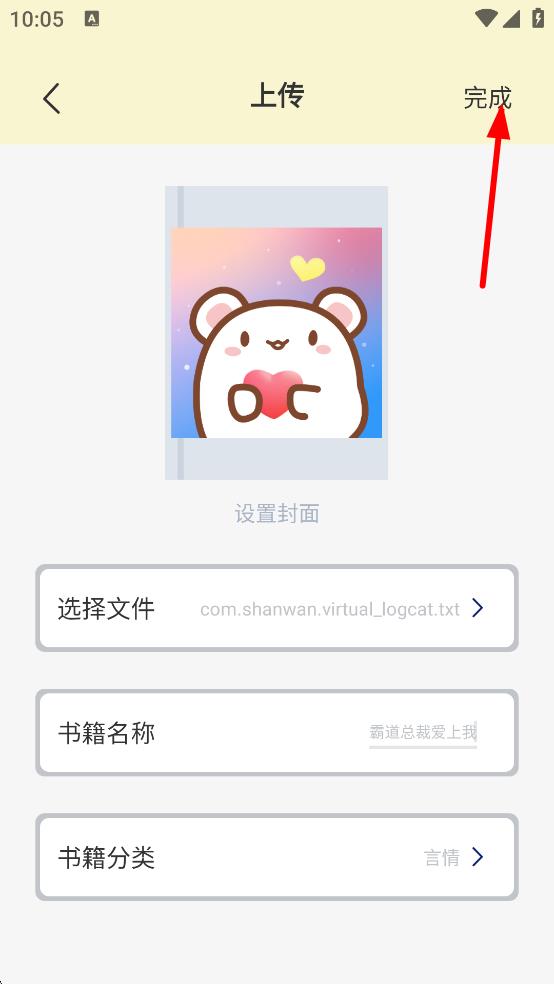 3、在上传书籍页面,设置封面、选择文件、填写书籍名称和分类后,点击完成,完成书籍上传。