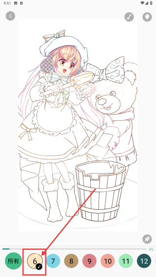 3、在涂色界面,点击颜色选项里的数字6,选取该颜色开始涂色。