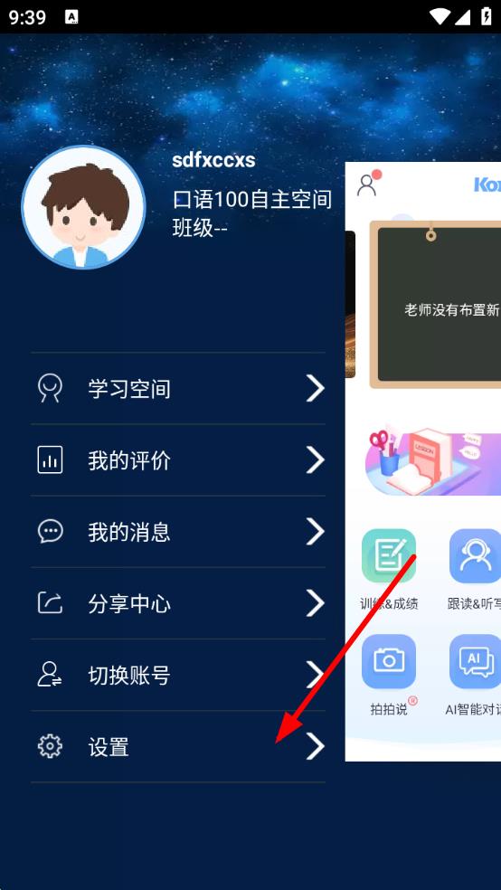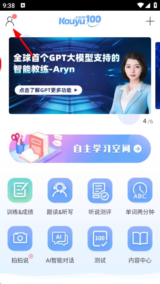 1、打开口语100应用,点击左上角头像图标,展开侧边栏菜单界面。