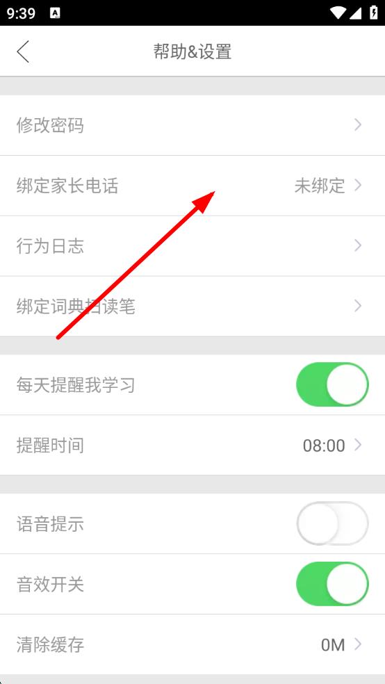 3、在帮助&设置页面里,点击绑定家长电话选项,按照后续提示操作完成家长手机号码绑定。