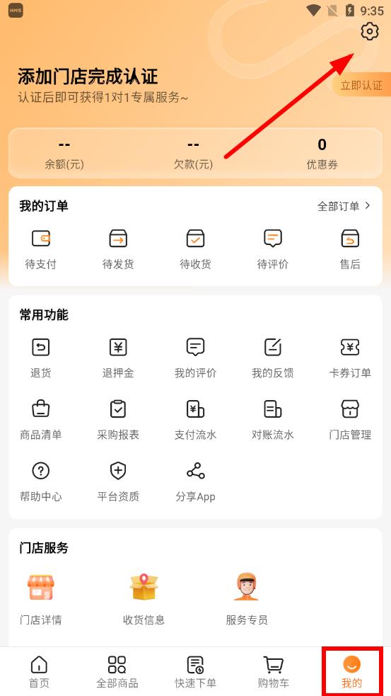 1、打开掌厨商城app,点击底部导航栏最右侧我的图标,点击界面右上角设置图标。