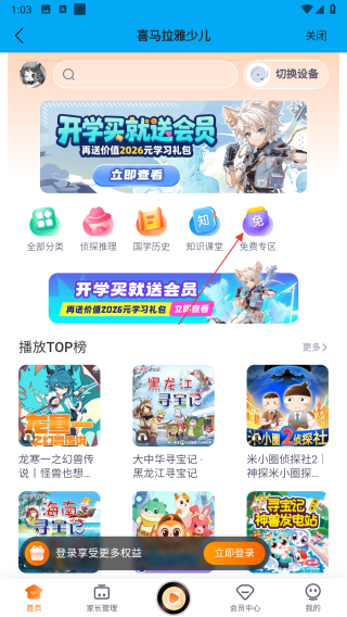 2、在喜马拉雅少儿页面中,找到免费专区按钮并点击,进入免费音频书籍列表页面。