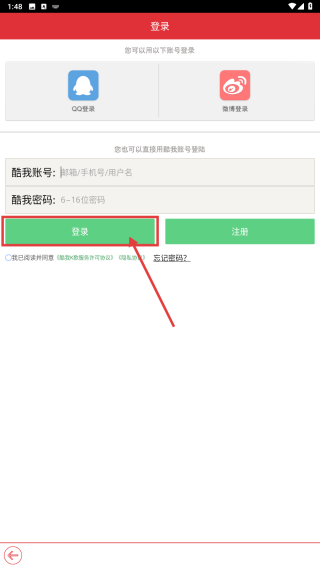 3、在登录界面,输入酷我账号和密码,点击登录按钮,完成账号登录操作。