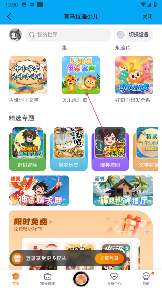 1、进入喜马拉雅少儿页面,在页面中找到想要播放的书籍并点击,进入书籍详情页。