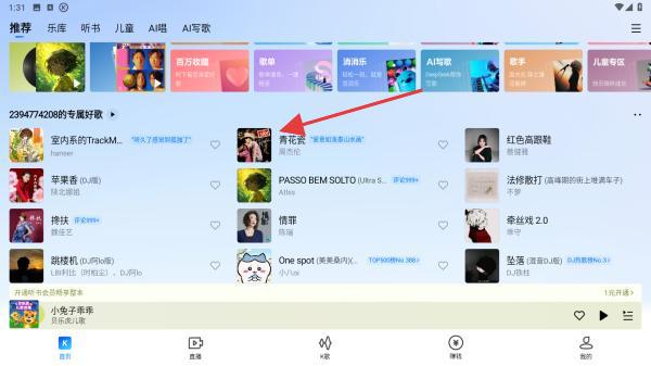 1、在推荐的页面内,用户可找到想要听的歌,点击即可开始播放。