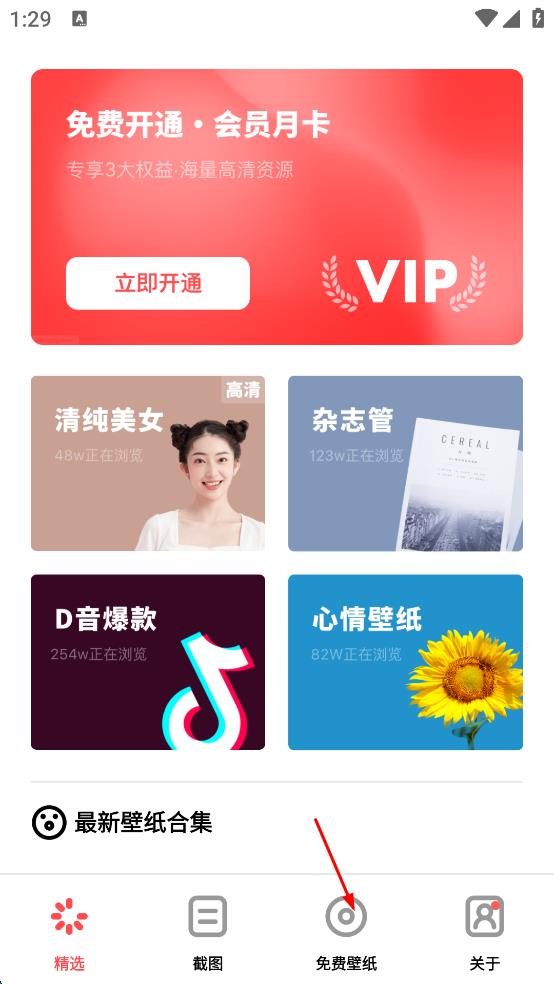 1、打开壁纸软件,在底部导航栏找到“免费壁纸”选项,点击该选项,进入免费壁纸页面。