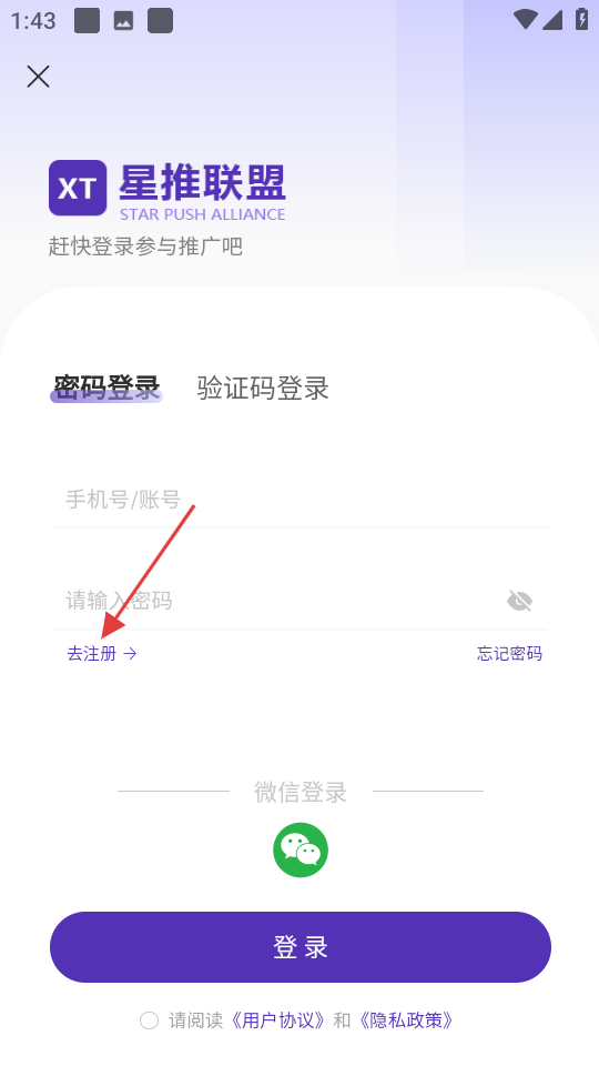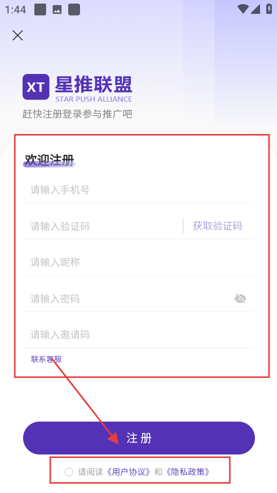 3、在注册页面,填写好信息之后,勾选协议再点击注册。