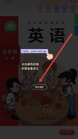 1、在进入点读课本页面时,浏览完使用方法后点击屏幕中的我知道啦按钮,开始使用。
