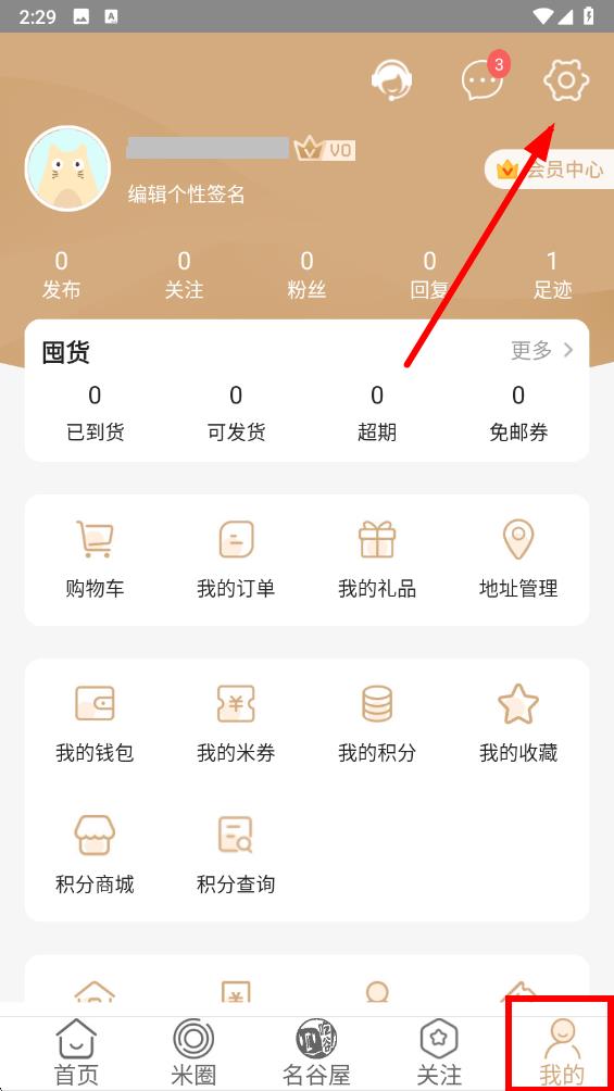 1、打开撒米APP,点击底部导航栏中的我的选项,进入个人页面,点击右上角的设置图标。