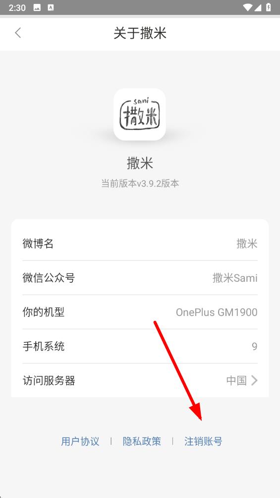 3、在关于撒米页面底部,找到注销账号选项,点击该选项后,按照提示完成身份验证等相关操作,注销后账号数据无法恢复。