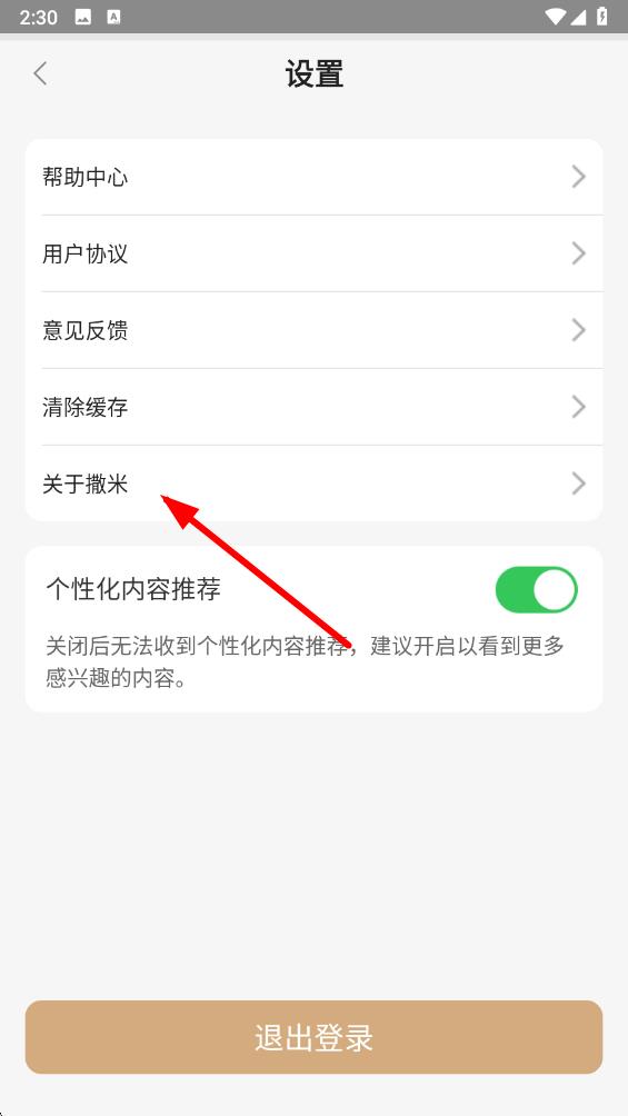 2、在设置页面中,找到并点击关于撒米选项,进入关于页面。