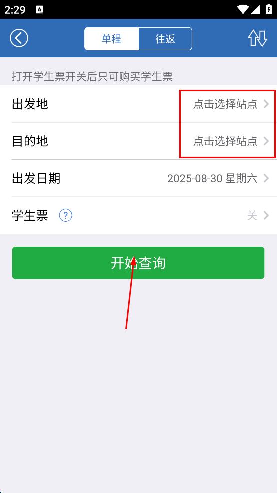 2、在车票预订页面,依次点击“出发地”和“目的地”对应的“点击选择站点”区域,选择好出发站点和目的站点,再确认出发日期等信息。
