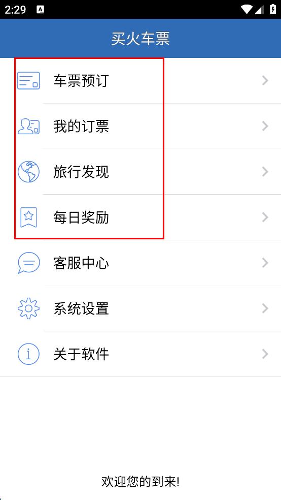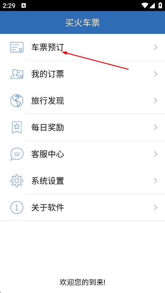 1、打开火车票购票软件,在主界面找到“车票预订”选项,点击该选项,进入车票预订页面。