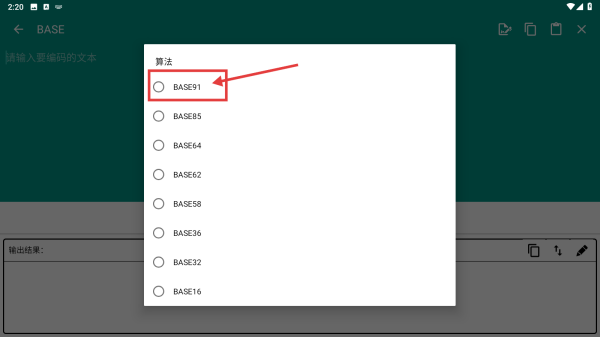 3、点击算法按钮,在弹出的算法选择列表里,点击BASE91选项,确定编码算法。