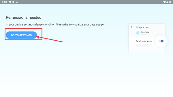 2、在权限设置引导页面,点击GO-TO-SETTINGS按钮,跳转到设备设置界面。
