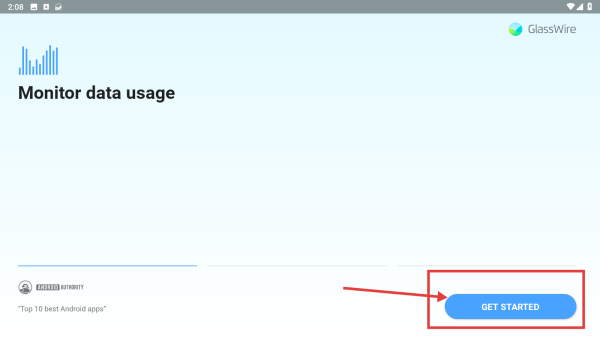 1、打开GlassWire应用,点击GET-STARTED按钮,进入权限设置引导页面。
