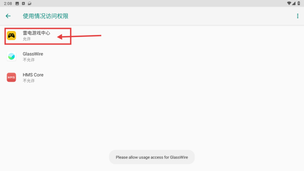 3、在设备设置界面的使用情况访问权限列表中,找到雷电游戏中心,确认其权限状态为允许。