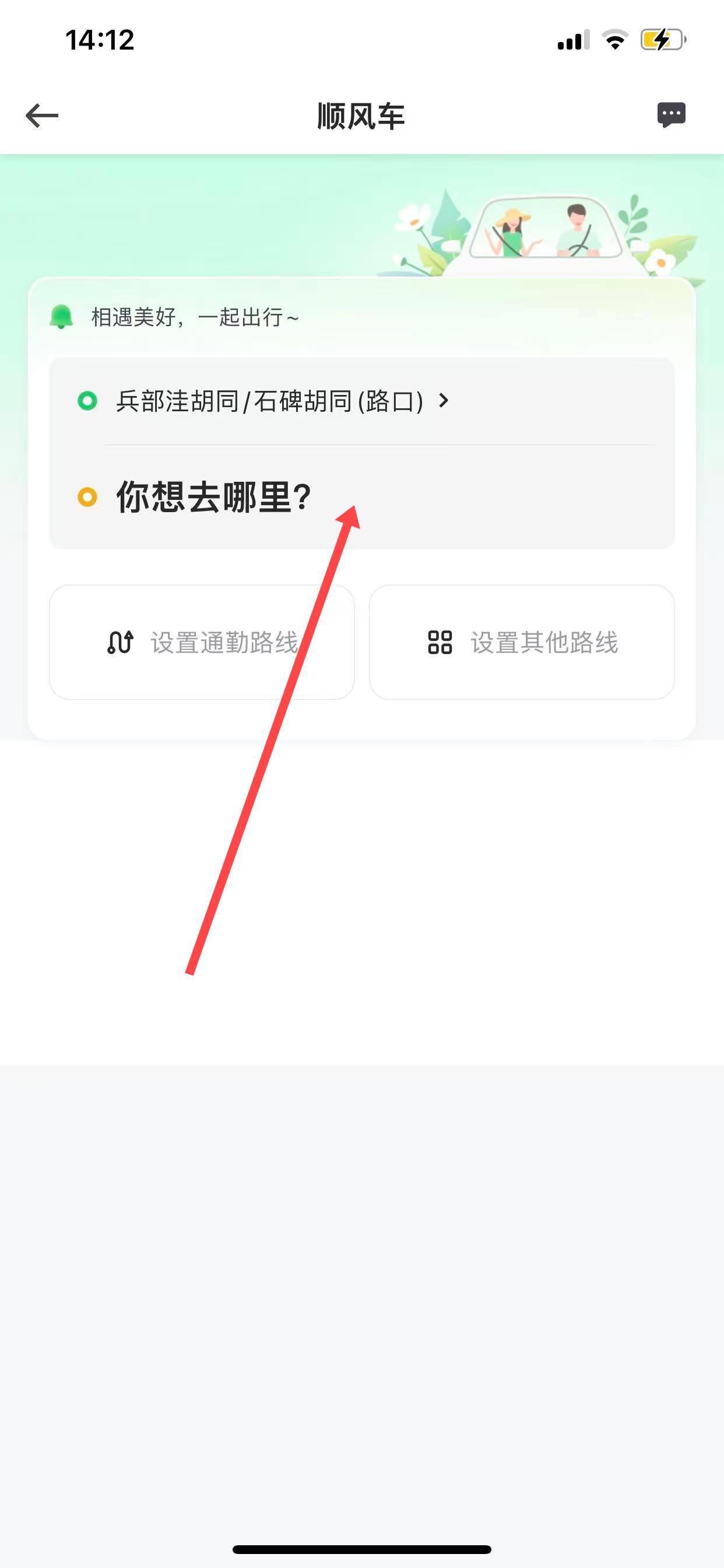 2、在顺风车服务页面,点击你想去哪里的输入框,输入此次行程的目的地。