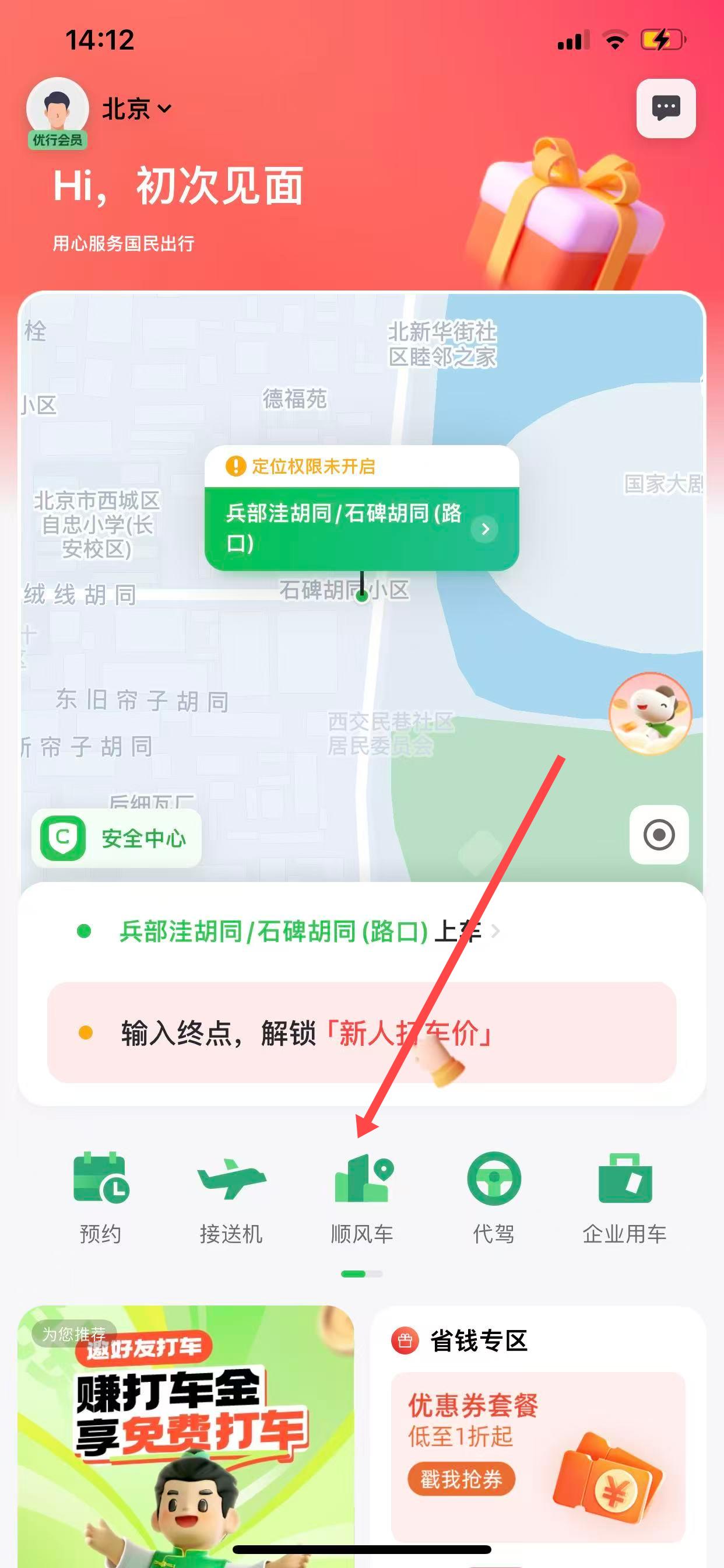 1、打开曹操出行App,进入主界面后,点击顺风车图标,进入顺风车服务页面。