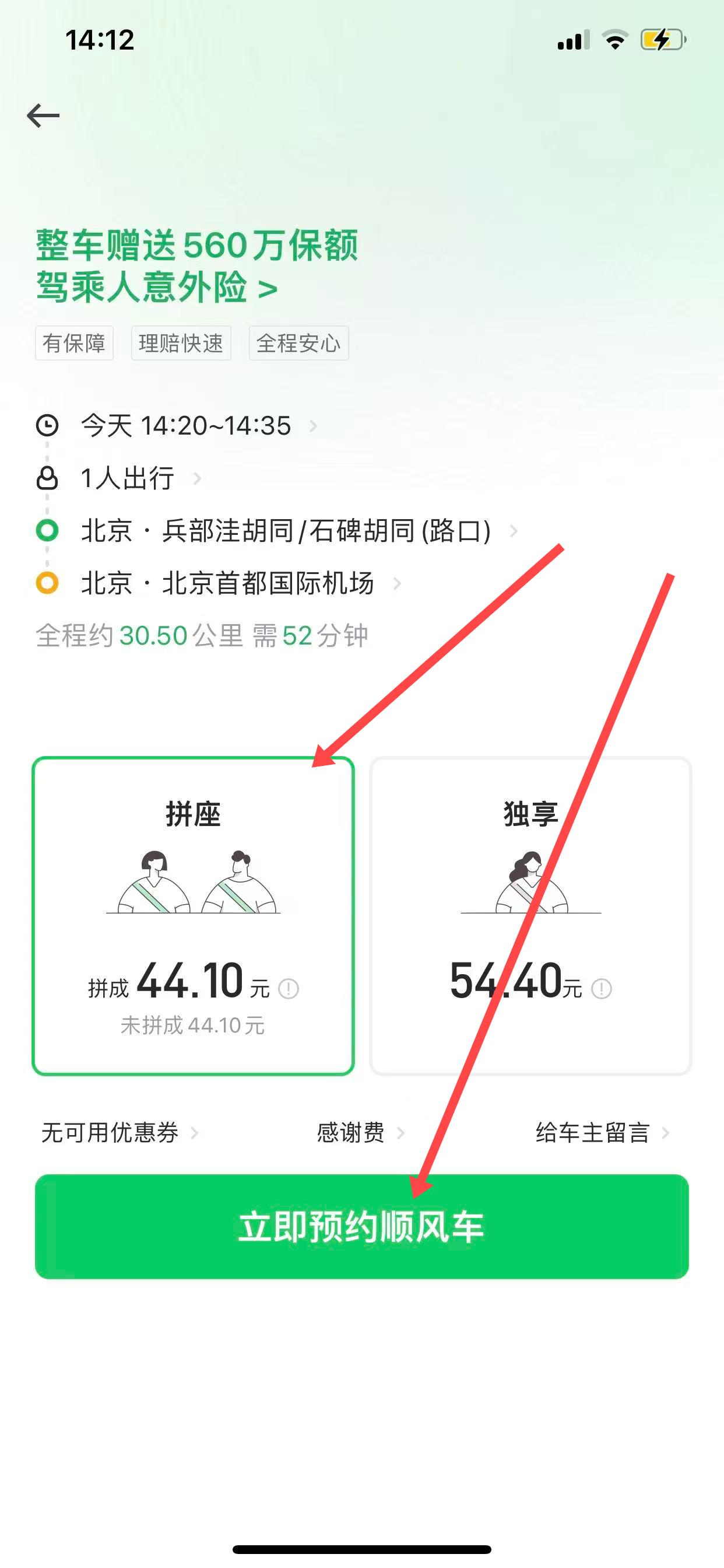 4、随后,选择拼座乘坐方式,了解对应的价格后,点击立即预约顺风车按钮,提交订单等待车主接单即可。