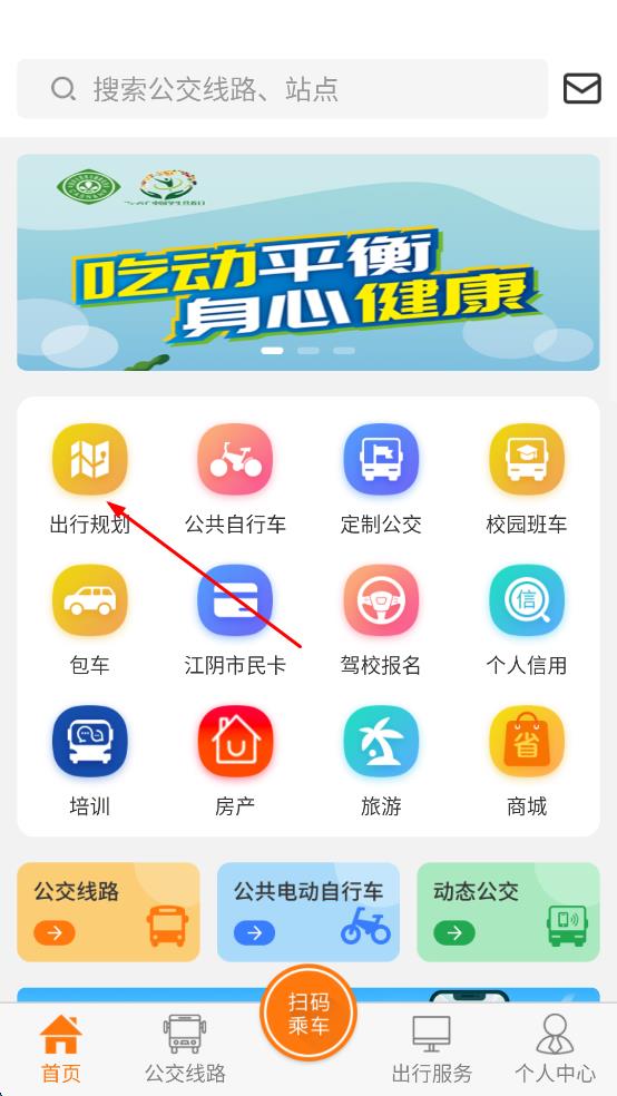 1、打开江阴出行类软件,在主界面找到“出行规划”选项,点击该选项,进入出行规划页面。
