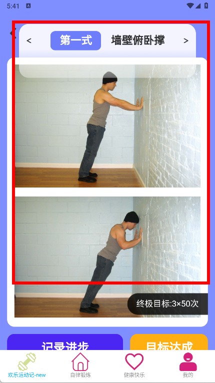 2、页面会展示第一式 墙壁俯卧撑的动作示范,可跟随示范学习该动作。