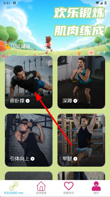 1、打开欢乐每天走,在欢乐锻炼 肌肉练成板块点击俯卧撑。