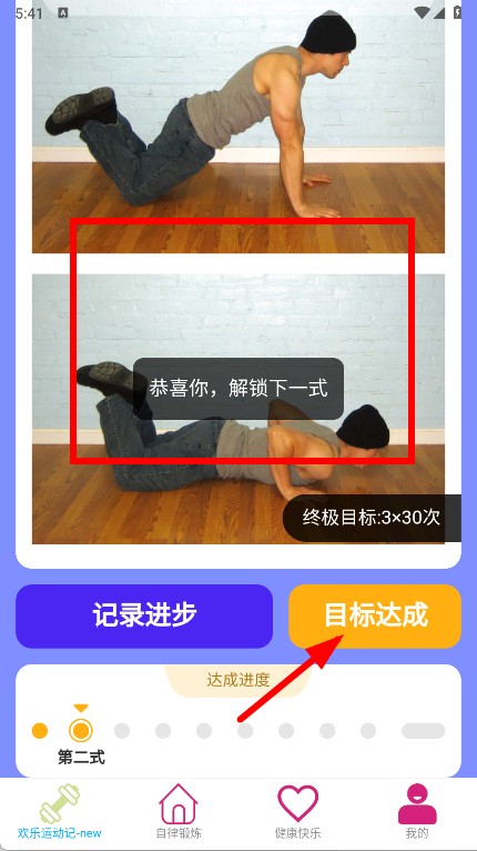 3、完成当前动作练习后,点击目标达成按钮,解锁下一式出现恭喜你。