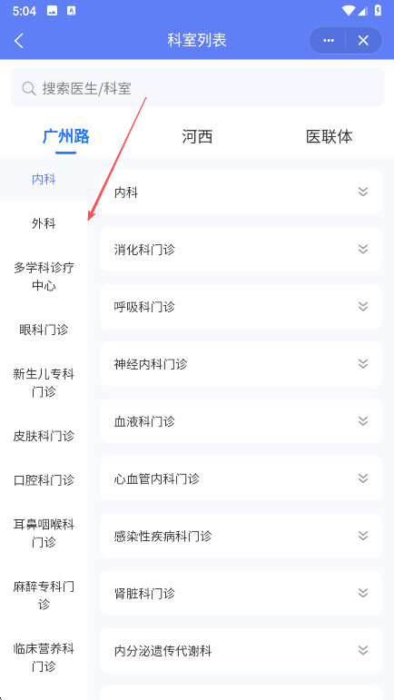 3、进入科室列表页面,根据需求选择院区,然后选择相应科室。