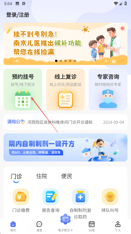 2、登录后,在首页点击预约挂号选项。
