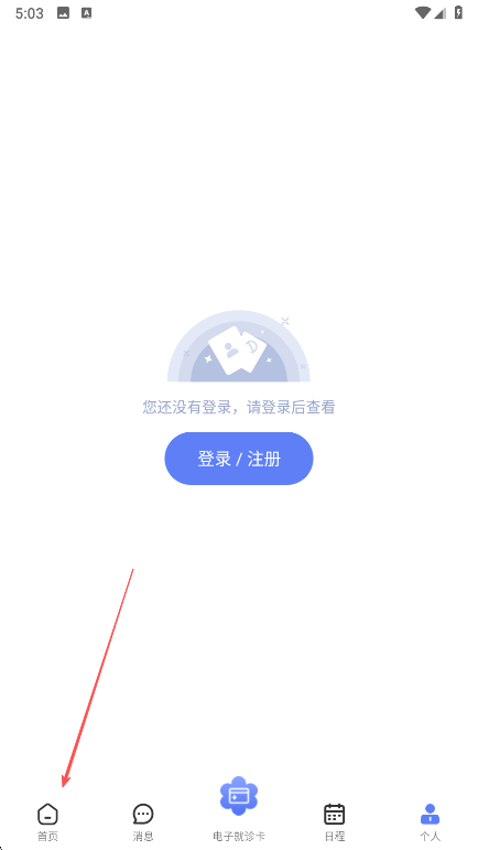 1、打开南京儿医APP,点击底部菜单栏中的首页。