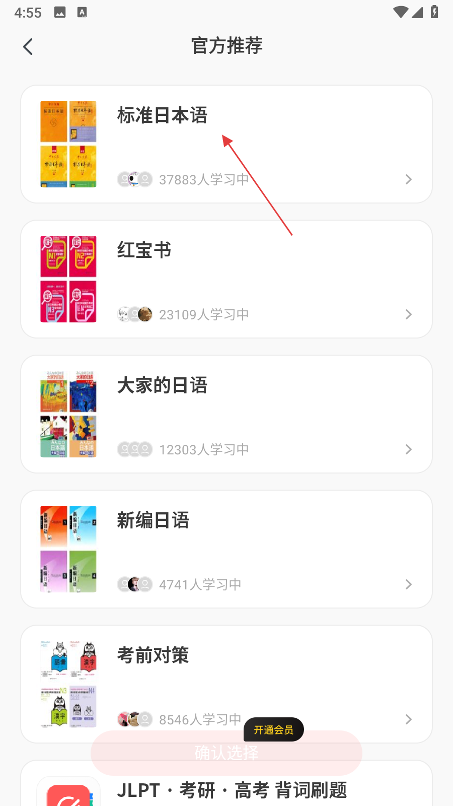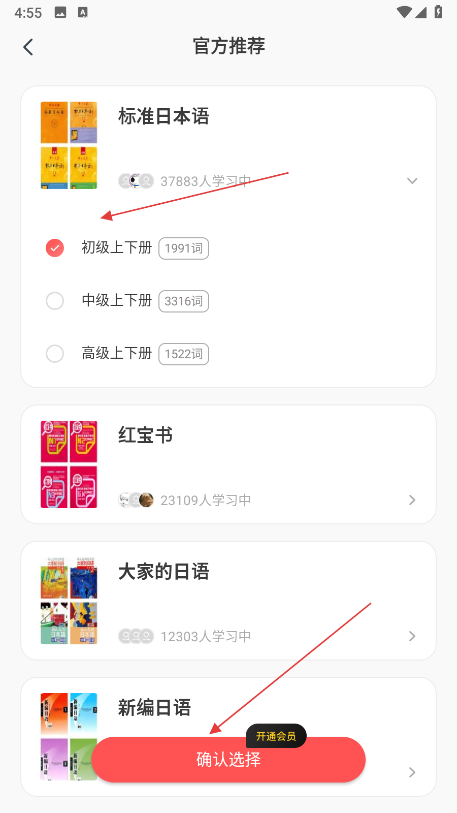 2、在词书列表中选择想要学习的词书,点击展开后选择对应的级别。