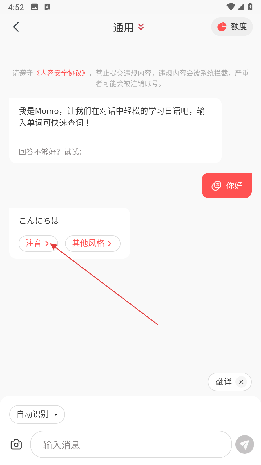 3、等待应用返回翻译结果,若需查看注音或其他风格展示,可点击翻译结果下方的注音。