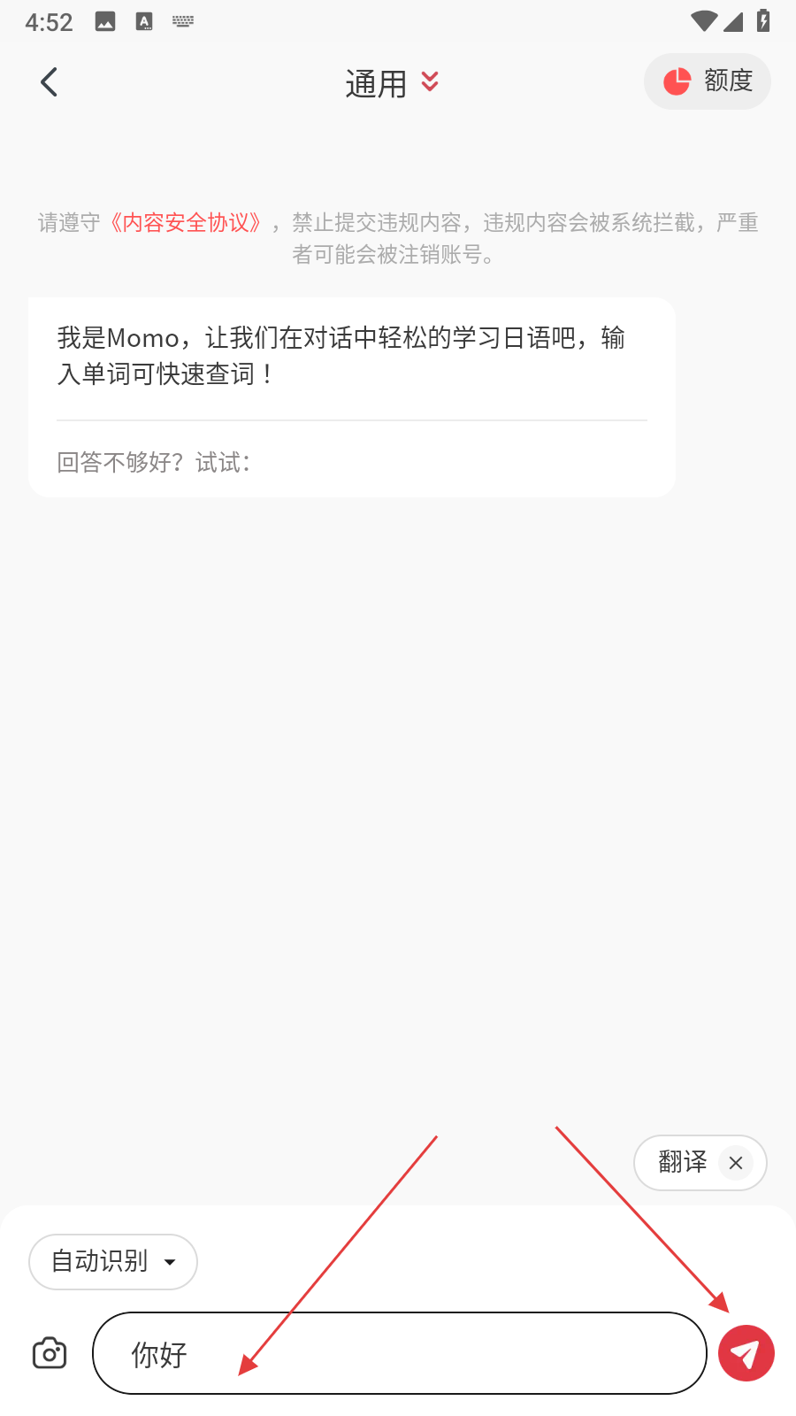2、在界面底部输入框中输入需要翻译的内容,输入完成后点击右侧红色发送按钮,提交内容。