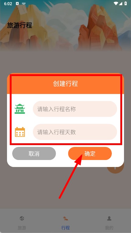 3、输入行程名称和行程天数,输入完成后点击确定按钮,成功创建旅游行程。