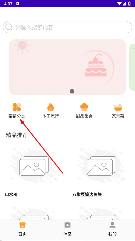 1、打开暴食大厨,在首页通过菜谱分类,本周流行等入口找美食,也能从精品推荐选菜品查看做法。
