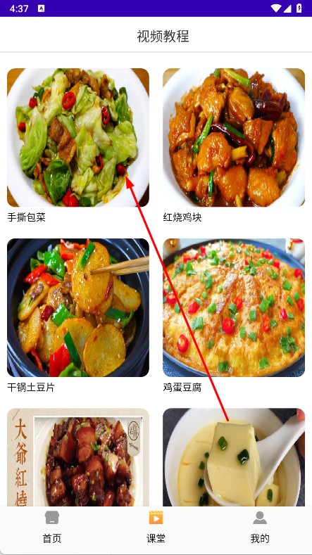 3、切换到课堂页,有鸡蛋热狗面包等视频教程,点击感兴趣视频,跟随视频步骤做菜。