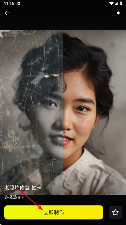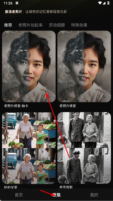 2、在发现页,选老照片修复相关模板,如老照片修复,点击进入详情页,点击立即制作。
