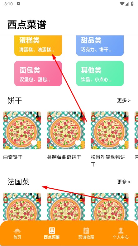 2、想找西点菜谱,点底部西点菜谱,选蛋糕类,甜品类等,还能浏览饼干,法国菜等板块美食,探索多样菜品制作。