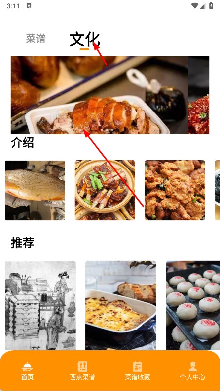 3、切换到文化页,了解饮食文化介绍、推荐内容,学习美食文化知识,也可用菜谱收藏保存喜欢的菜谱,方便随时查看制作方法。