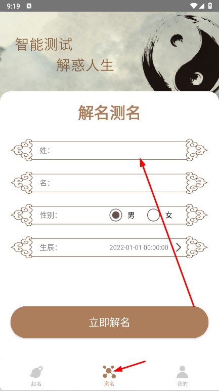 3、切换到测名页,在解名测名栏填姓,名,选择性别,生辰,点击立即解名,进行姓名解析,借助多维度分析。