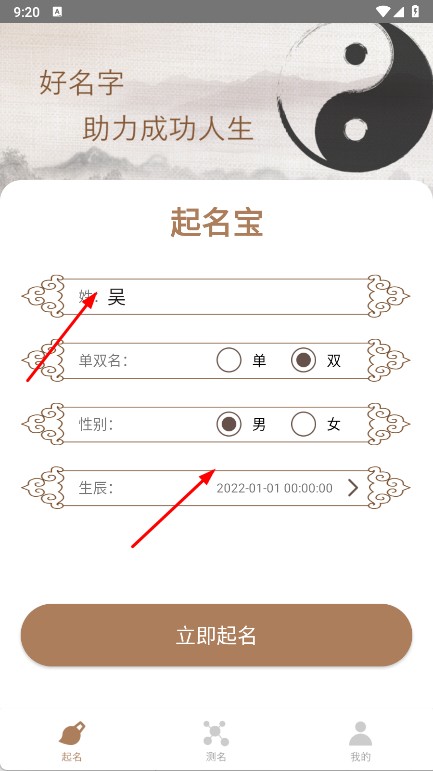 2、进入起名页,在起名宝栏填姓,选单双名、性别、生辰,点击立即起名,获取适合宝宝的名字。