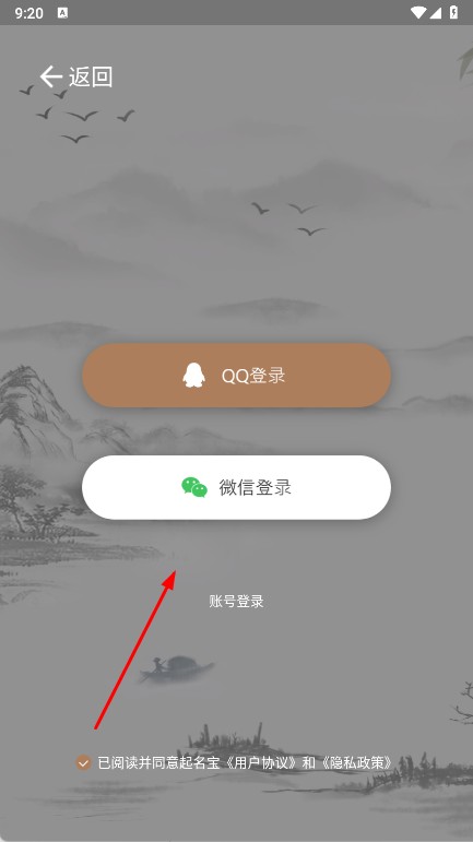1、打开起名宝,若需登录,在登录页选微信登录,QQ登录或账号登录,勾选协议后完成登录。